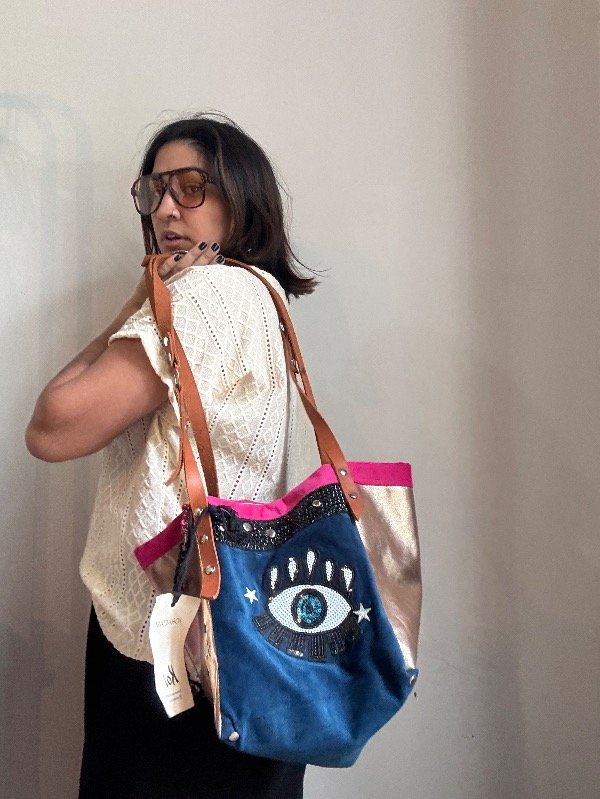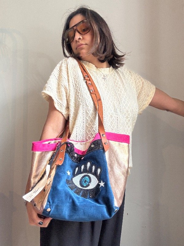 Bolso confeccionado en eco cuero y pana, aplique de 👁️ correa de cuero, con detalles de argollas.