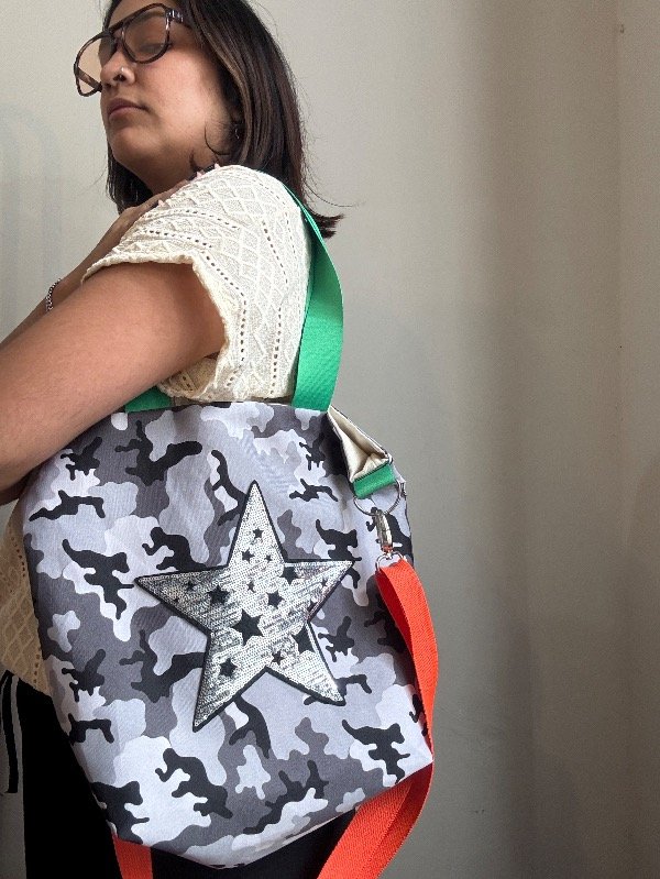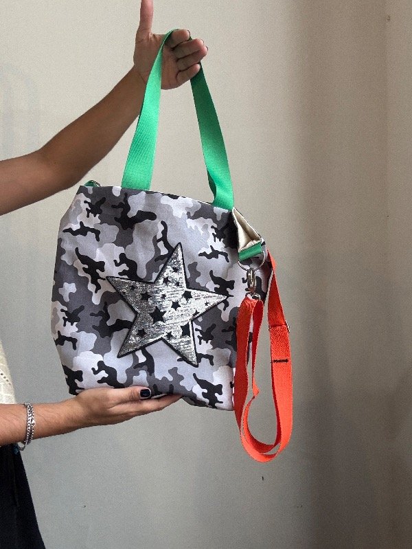 Tote bag camuflado con aplique de estrella, incluye correa regulable